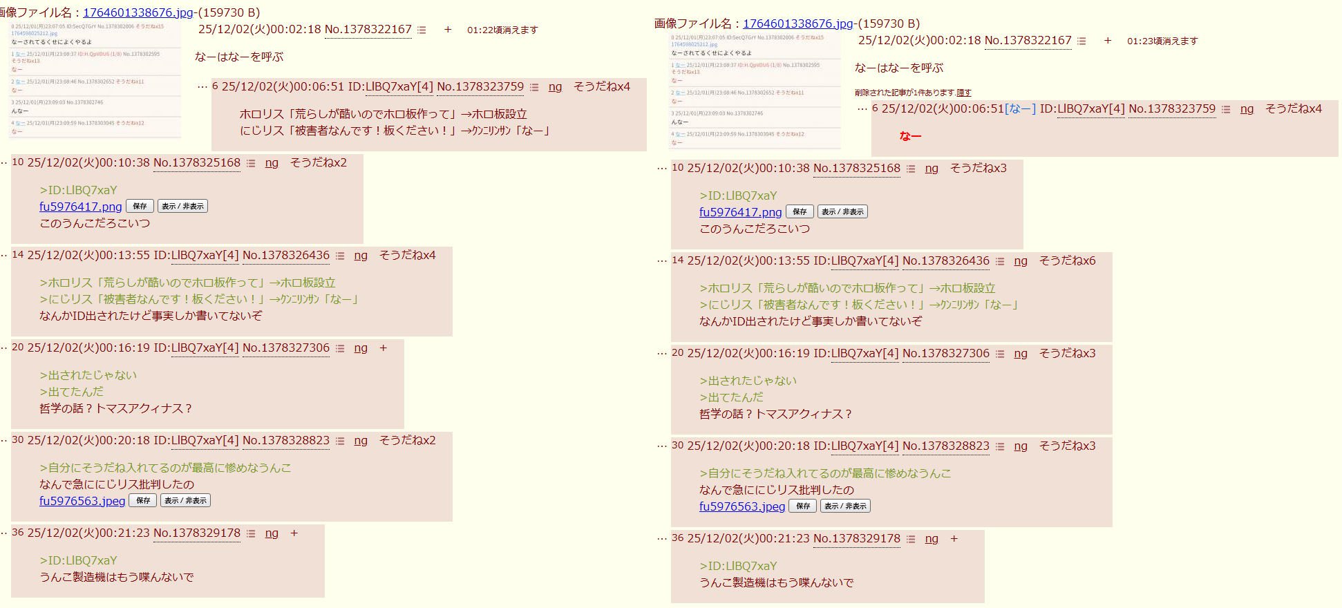 | … | 59326/03/09(月)21:55:57No.1409250660+ハヤトくん粘着スレのローカルルールじゃ話されたくないにじリスがすぐID出すから内容で判断するらしいけどID出されるっていうのは恥ずかしいことなんだよ? |