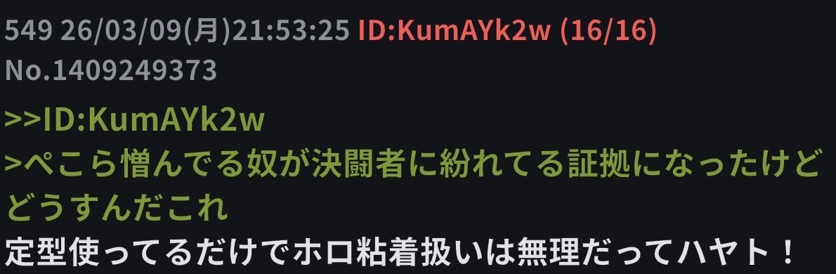 | … | 62826/03/09(月)21:59:16No.1409252436そうだねx4>やっぱハヤトってにじにもホロにもいちゃもん付けたいだけのカスじゃん |