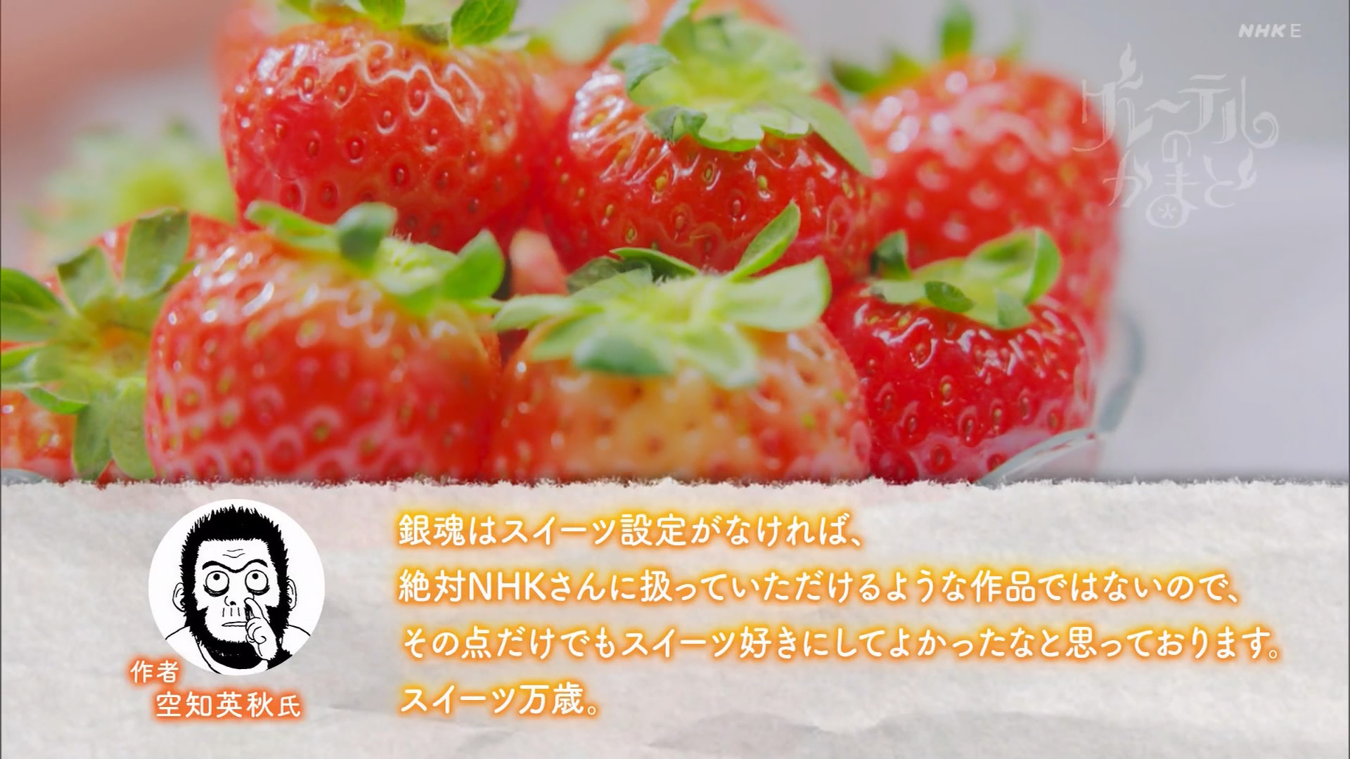 連載終了後も人気の漫画『銀魂』。突如襲来した宇宙人により、高度な発展を遂げた江戸時代、という斬新な設定で繰り広げられる型破りなコメディーだ。主役銀時の大好物が、いちご牛乳と週に一度のお楽しみといういちごののったパフェ。いったいなんでいちごパフェ?どうして銀時はこんなに甘いものが好きなの?数々の疑問を作者にぶつけて!さあ、いよいよ長年の疑問も万事解決!?ヘンゼルも出来立ていちご牛乳に舌鼓を打つ!