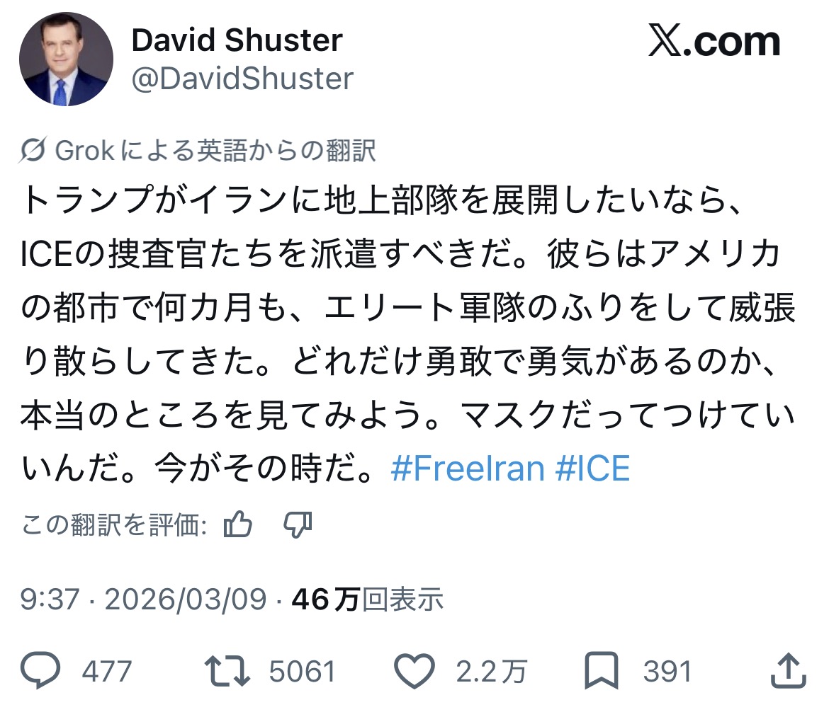| … | 46026/03/10(火)00:30:55No.1409308955+>イランのせいなんですーいうならアメリカはさっさと地上軍出してイラン制圧しろよ |