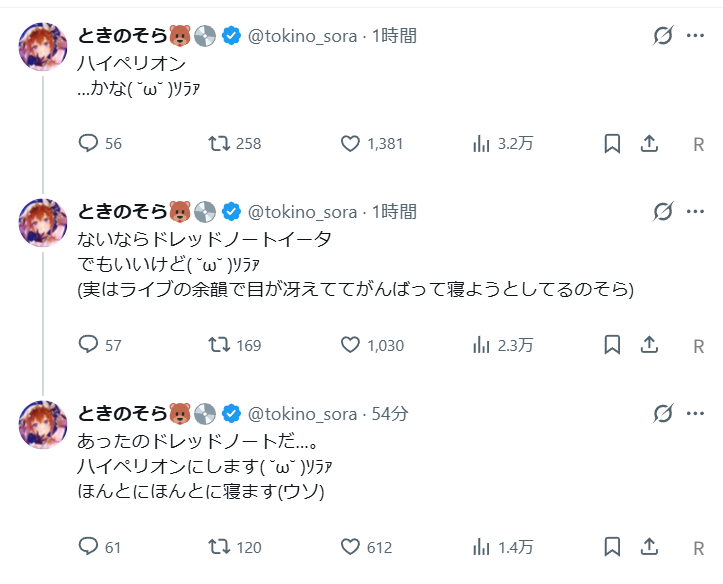 | … | 65126/03/10(火)10:55:55No.1409367226+俺はそらちゃんのポスト何言ってるのかサッパリ分からなかったぜ? |