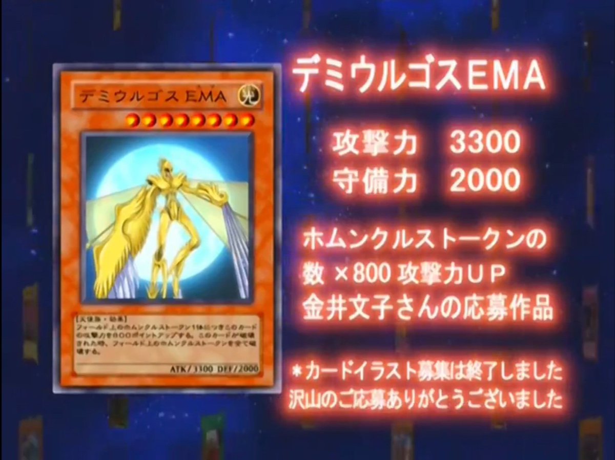 | … | 7126/03/10(火)11:35:26No.1409373479+応募で採用されたカードは結構凝ってる名前の奴多いというかむしろあんな直球なのダークゴッドくらいだ |