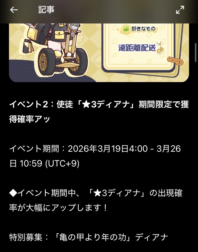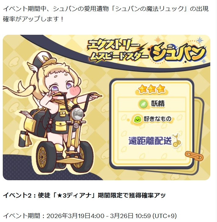 | … | 1326/03/10(火)19:43:13 ID:4CQzRzikNo.1409489327そうだねx4>イベント2:使徒「★3ディアナ」期間限定で獲得確率アッ |