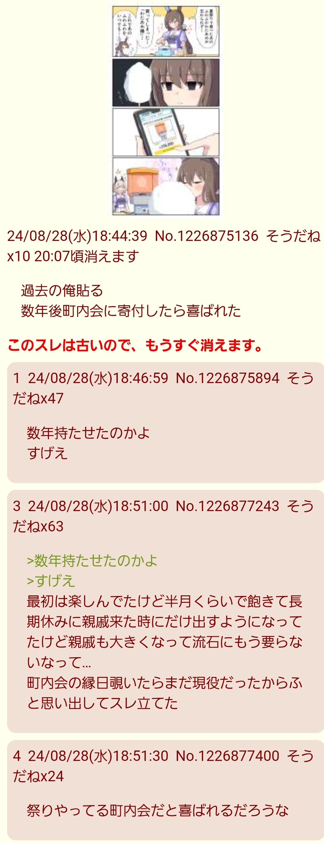 | … | 426/03/11(水)01:31:42No.1409599496+たしか町内会の人になんでこんな持ってたの?と聞かれて笑って誤魔化した結果町内会の人があそこのおじさんに寄付されたからお礼言いなさいみたいな話になって知らないガキからわたあめ屋のおっちゃんと呼ばれるようになったみたいなオチだったきおく |