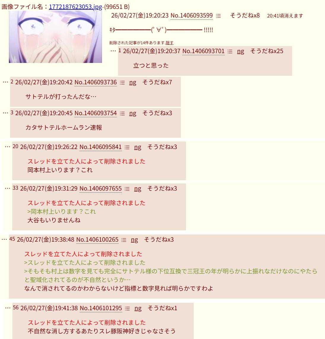 | … | 6026/03/11(水)10:01:49No.1409644682+>これ何が酷いって別に阪神ファンですらないってこと |