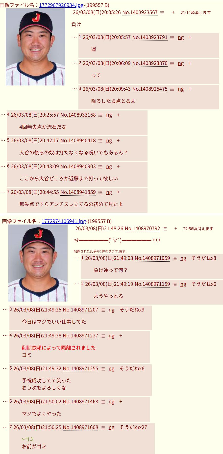 | … | 18826/03/11(水)11:48:09No.1409663761+村上とか近藤の言動や容姿いじってる奴のID辿ると茶化したレスが多いからWBCっていうお祭り騒ぎに便乗したいやつが増えてる感じ |