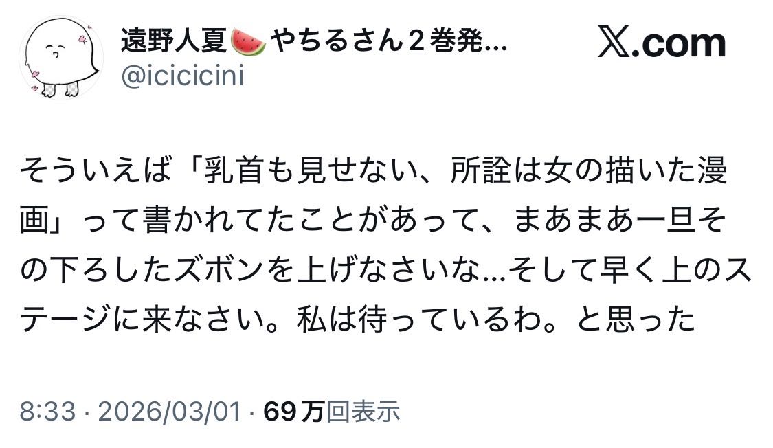 | … | 1026/03/11(水)12:08:42No.1409668836そうだねx6すいませんこれえっちな漫画じゃないんですよぬ |
