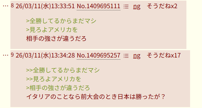 | … | 126/03/11(水)13:13:07 ID:NlT8aYNINo.1409689857+🇺🇸監督が予祝して負けそうになってんだからやめろ |