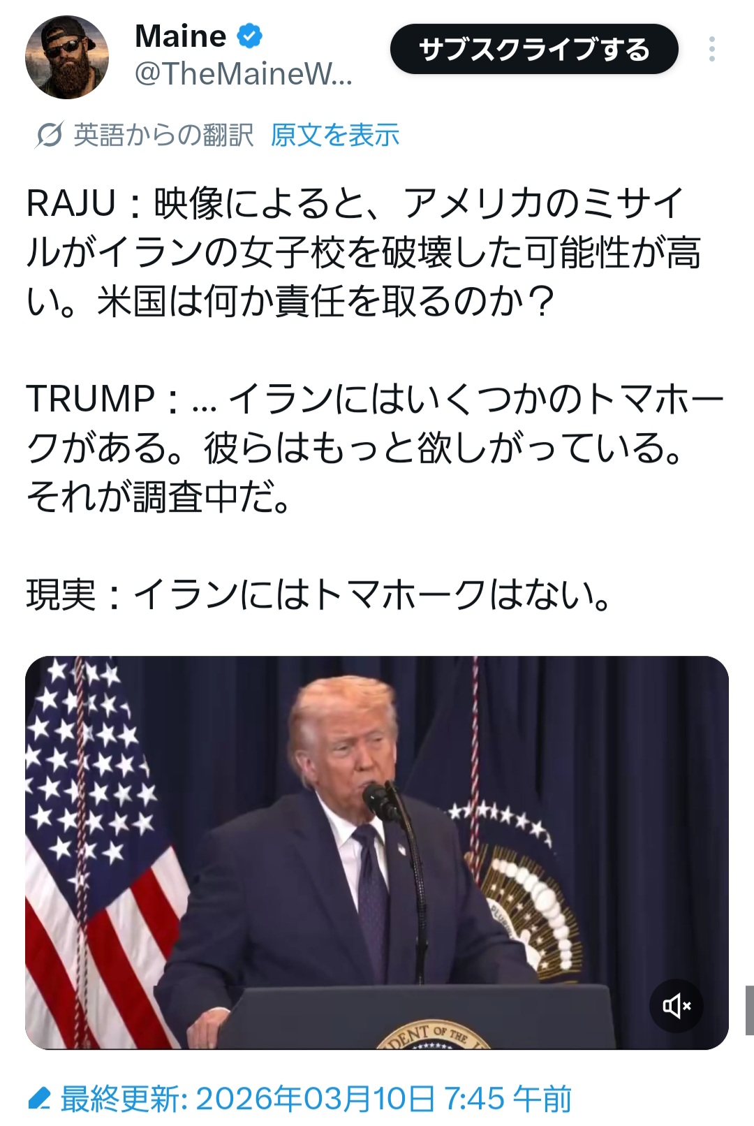 | … | 5026/03/11(水)21:30:10No.1409831491そうだねx46>マジでバイデンのこと笑えないだろ… |