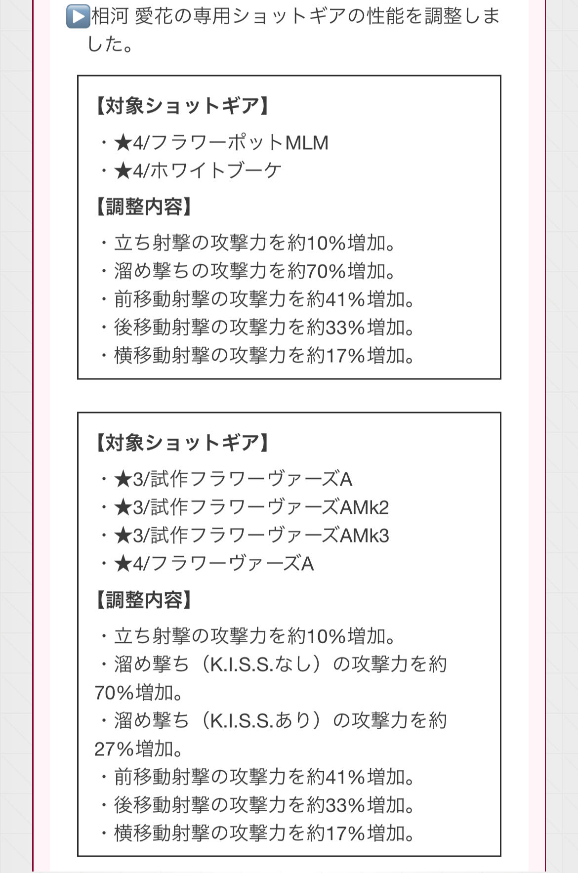 | … | 2926/03/12(木)14:57:00No.1410026485そうだねx1ホワイトブーケ試してみたっすけど訓練プリ君じゃよくわからんかったっす愛花ちゃんメインで使ってる人の見解が知りたいっすね あと前射ダメージダメージ増やすのは良いっすけど反動で全然近付けない方がよろしくないと思ったっす |