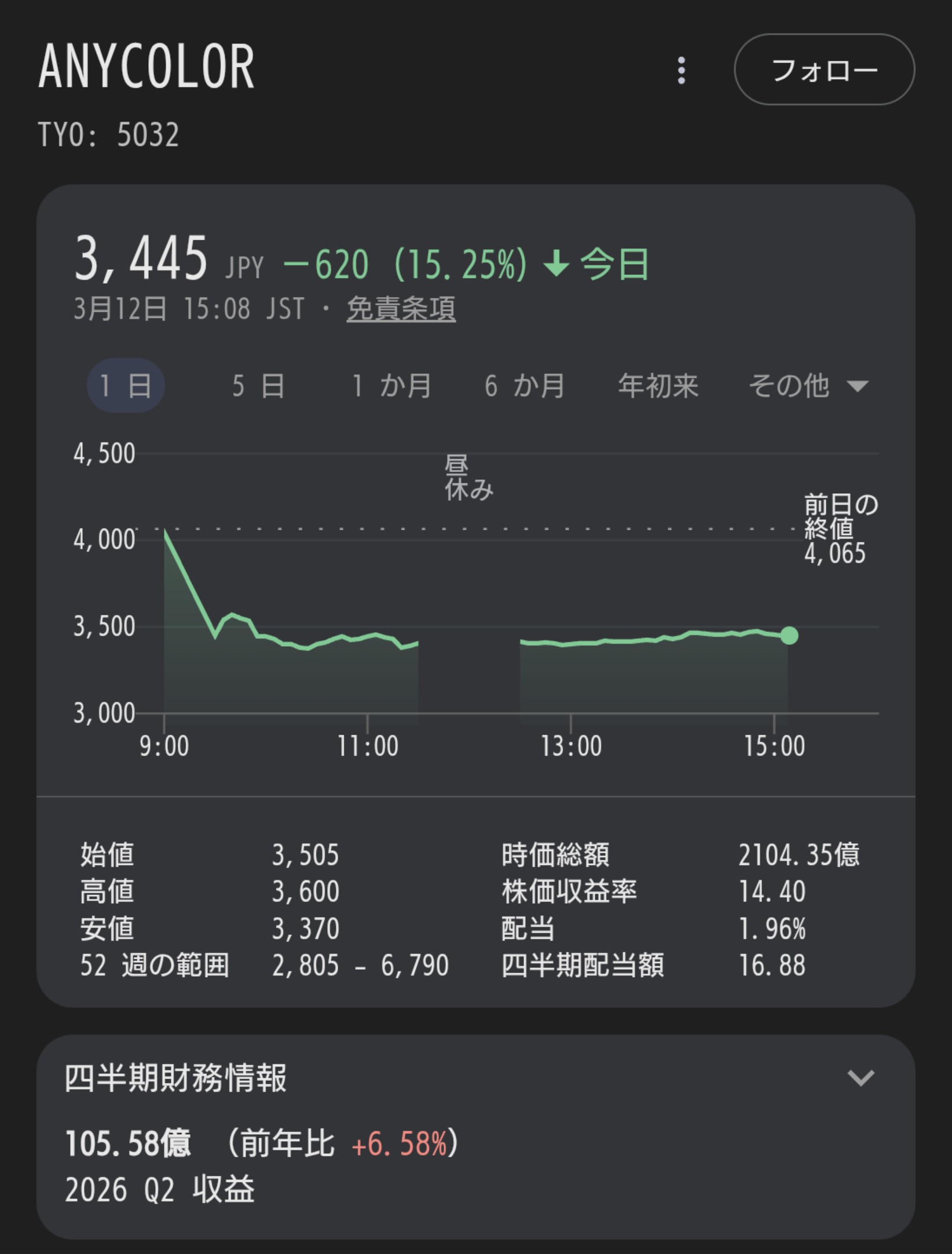 | … | 4526/03/12(木)15:35:33 ID:b8C02JLYNo.1410035715+>出来高 6,134,800株 |