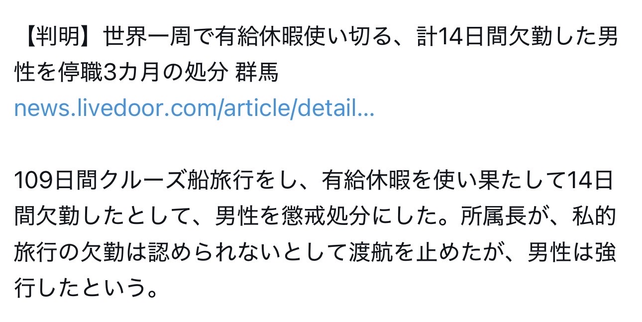 | … | 3426/03/12(木)19:10:56No.1410088548+公務員の有給休暇が20日だから最大で2年分の40日 |