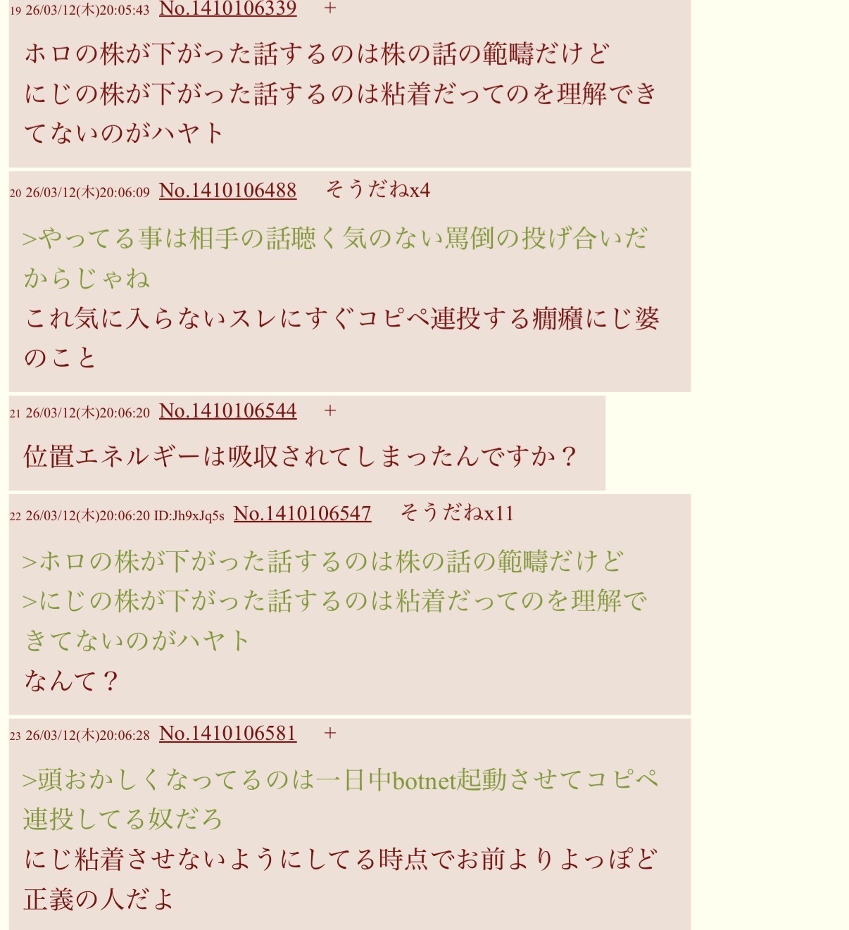 | … | 8026/03/12(木)20:57:33No.1410124607+>>隔離されたスレで普通に株価語られて癇癪起こして結局コピペ開始したチンパンジーだ |