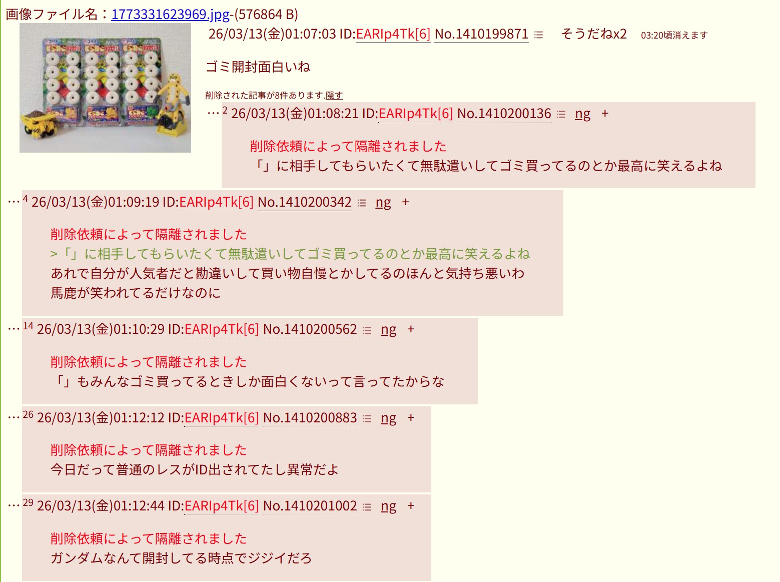 | … | 626/03/13(金)01:09:26No.1410200362そうだねx24>「」に相手してもらいたくて無駄遣いしてゴミ買ってるのとか最高に笑えるよね |