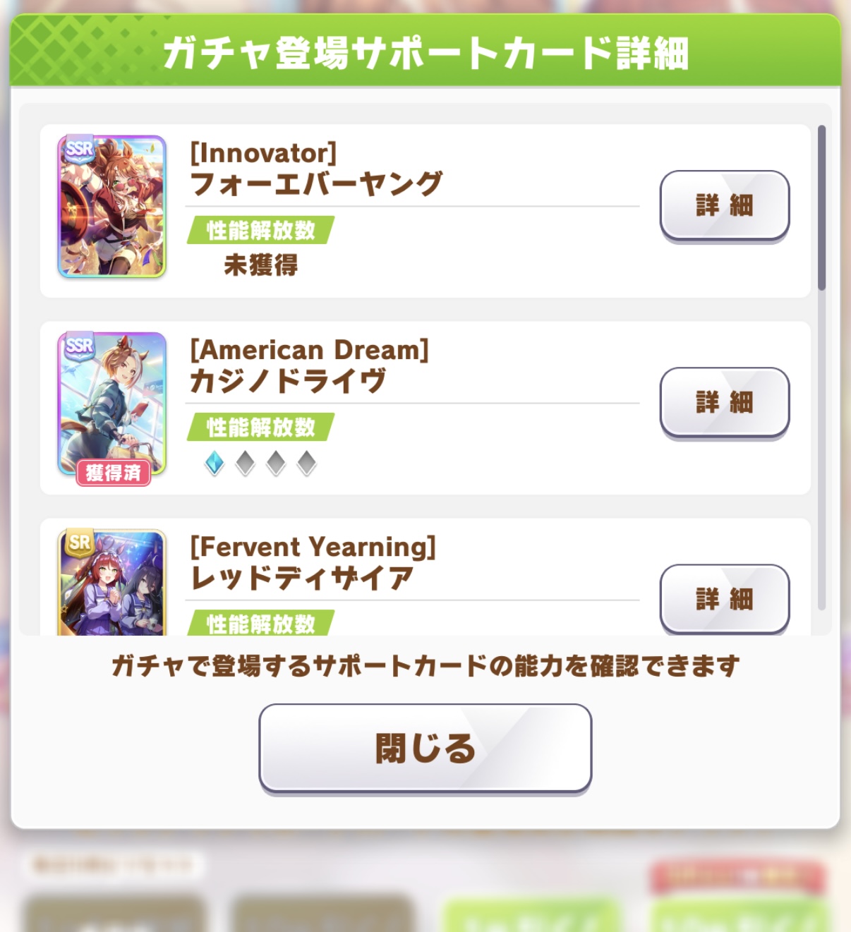 | … | 3626/03/13(金)08:48:12 ID:4nHnPWMcNo.1410233777そうだねx1>本育成の時に選んだレースでもらえる金スキルどうしたらいいんですか!と思いましたが単純に今回のチャンミ条件と同じの選べばいいんですね女帝が前提スキル持ってきてくれますし |