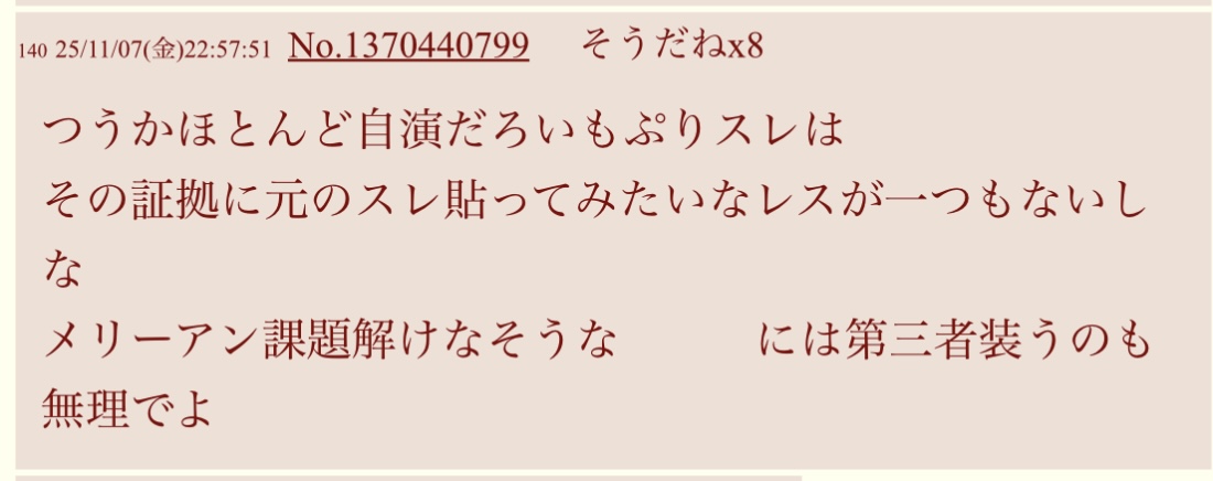 | … | 8026/03/13(金)12:44:24No.1410281406そうだねx1>匿名掲示板のスクショが何らかの事実や証拠になると思ってる統失、あんまり触れたくないヤバさがあるんだよな |