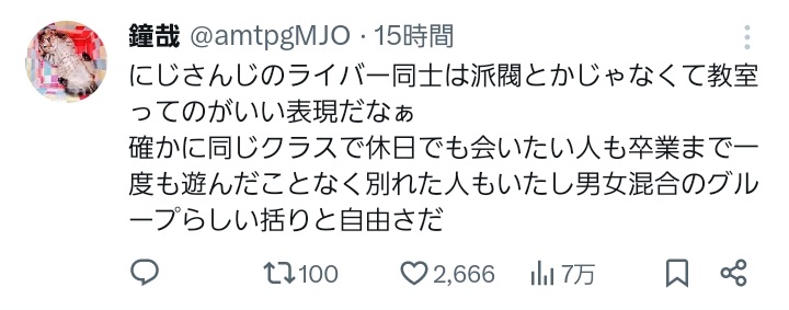 | … | 7826/03/13(金)12:12:54No.1410271145+体育会系とかほぼいなくて、加藤純一でコミュニケーションを学んだライバーばっかりだから |