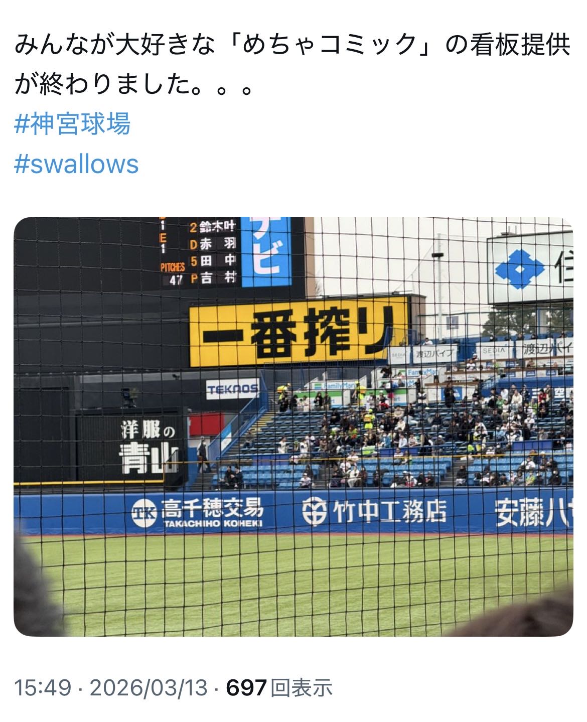 | … | 5726/03/13(金)14:50:58 ID:sH4Hg0pENo.1410307832そうだねx1🐧👈これ明治神宮球場を借り家にしながら反天皇を掲げる反日球団 |