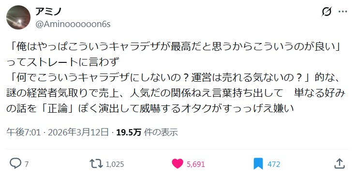 | … | 8026/03/13(金)15:40:33No.1410317924+>俺の好みに合わせたほうがもっと売れた理論は根拠を提示しなくていいので無敵 |