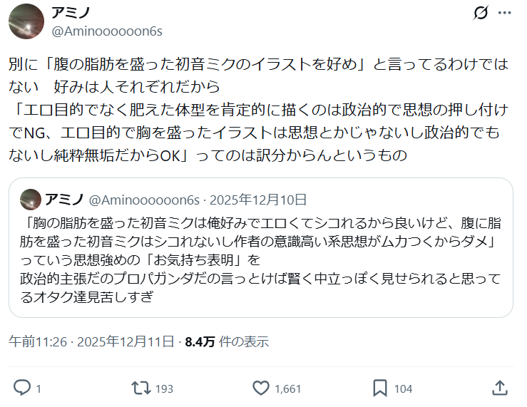 | … | 27026/03/13(金)16:27:35No.1410327693+みんながダメって思ってるものは否定しても問題ないというか肯定すると逆に叩かれるから流れ次第 |