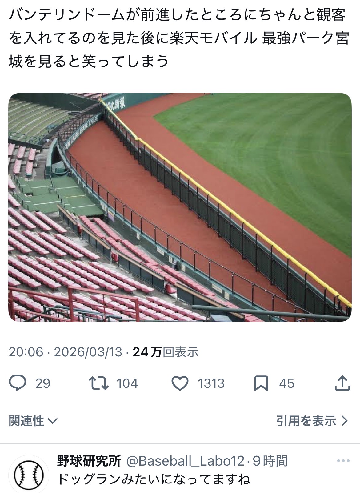 | … | 27626/03/14(土)10:15:34 ID:Am4sZmdwNo.1410541338そうだねx3実際⚾️に合わせて球場弄らなきゃいけないハメになってるのアホすぎるとは思うゾ |