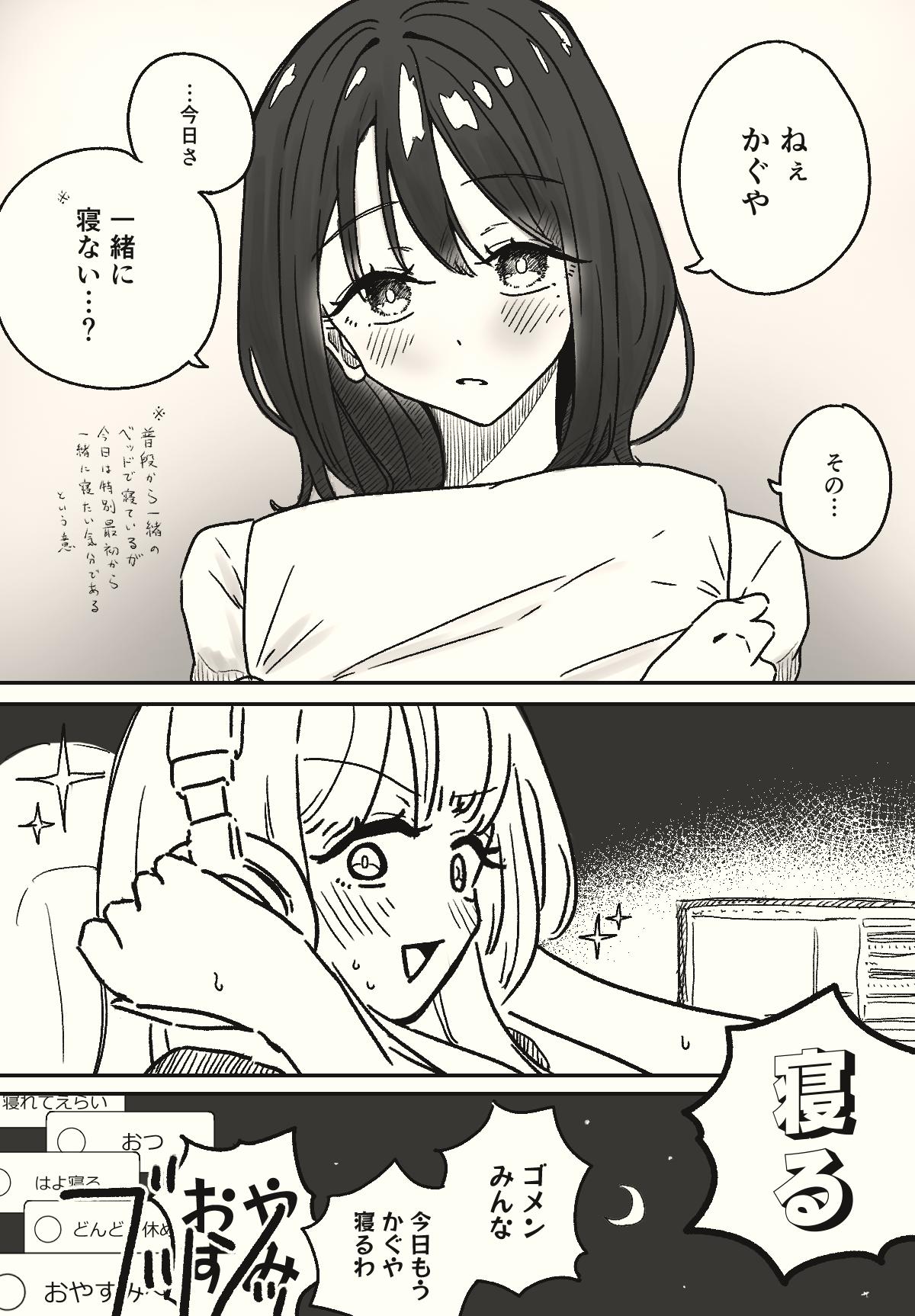 | … | 5426/03/14(土)15:54:36No.1410627704+>>>これやると寝るのも一緒になるよ >>かぐやと寝ると彩葉は安眠できるのは公式設定のはず >彩葉から誘うかかぐやから誘うかの差でしかないんだよね… でも彩葉から誘ってくれるとちょううれしい fu6414314.jpg |