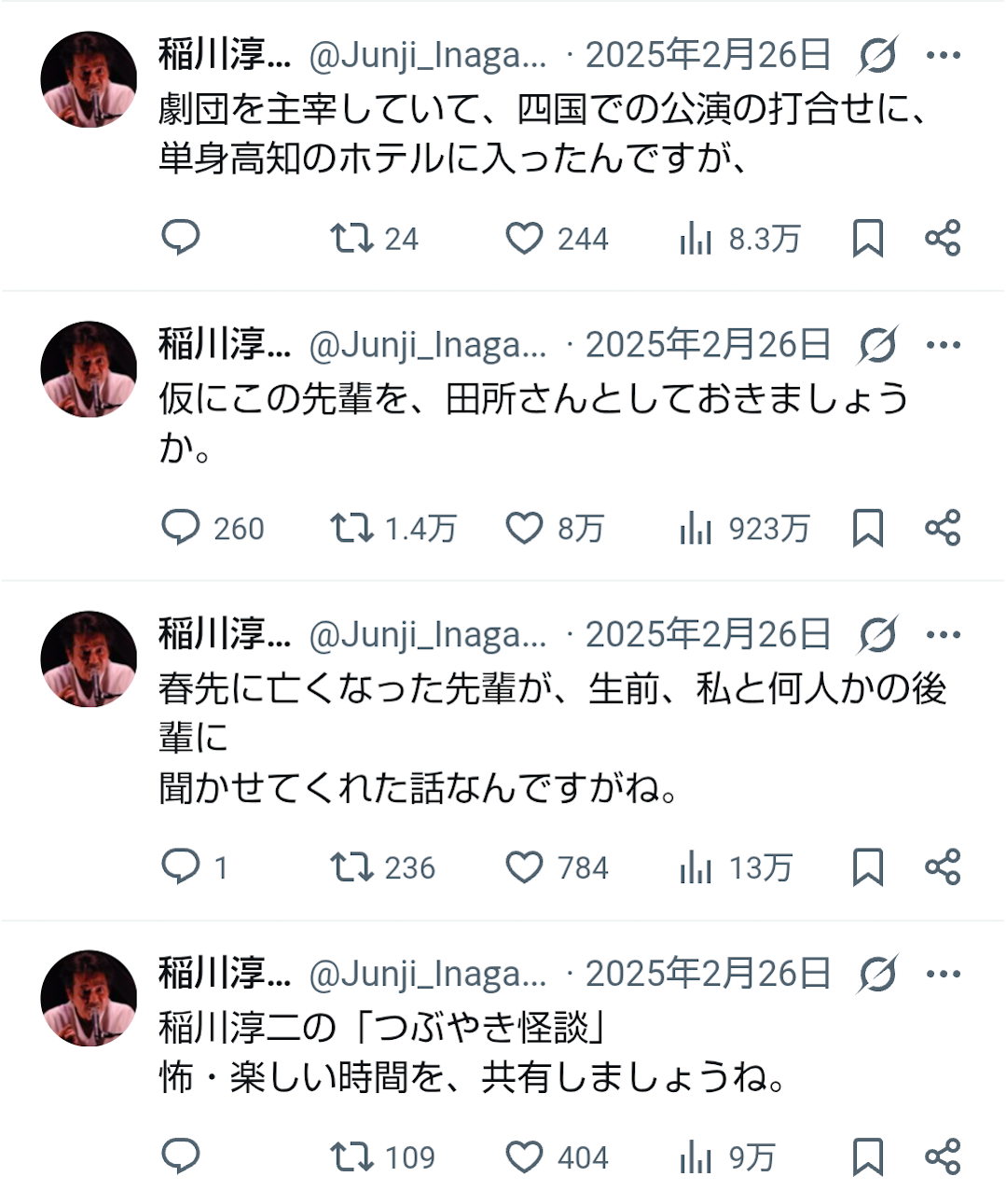 | … | 426/03/14(土)13:57:42No.1410595190+稲ジュンの怪談には田所さんの話けっこう色々あるんだよな |