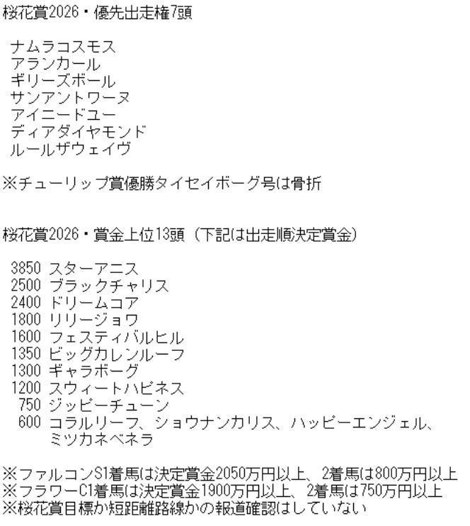| … | 6426/03/14(土)17:22:36No.1410650326+>若葉S出る産駒いないので明日のスプリングS次第では皐月賞も参観になりかねませんね… |