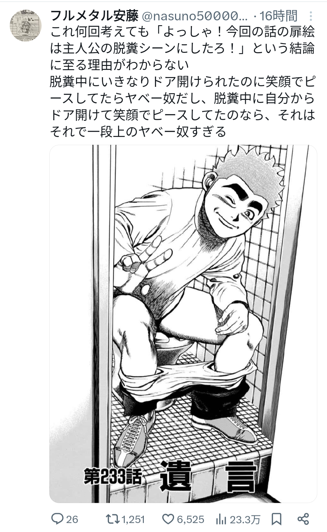 | … | 3326/03/14(土)18:04:47No.1410662476+重い話の最中だから主人公が糞する下ネタやって空気を軽くしようってだけだろ |
