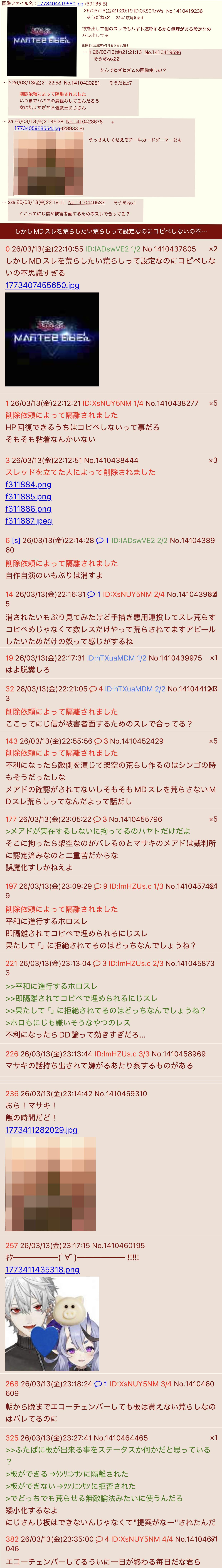 | … | 8326/03/14(土)22:06:04No.1410756106+粗品のスレですらにじリスがーやってたの見たけどあのスレもコピペ来てなかったと思う |