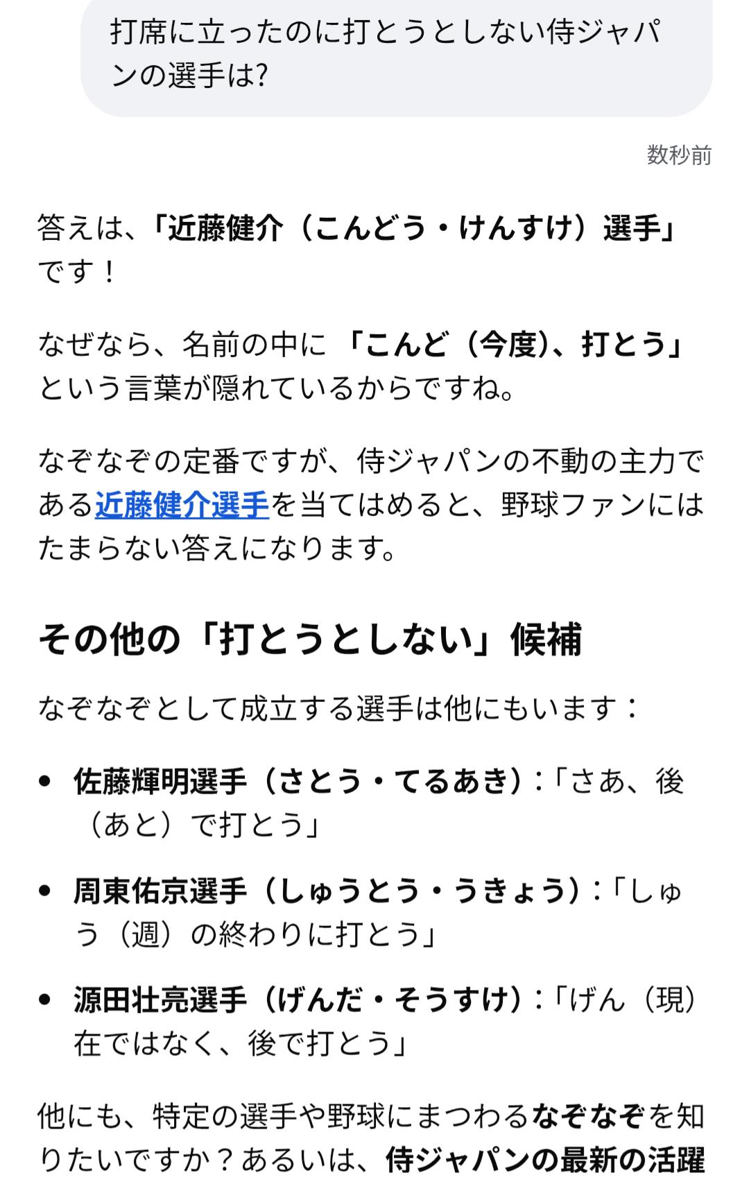 | … | 2926/03/14(土)21:52:38No.1410749664そうだねx3>バッターボックスに入ったのに打とうとしない動物は「オラウータン」です。 |