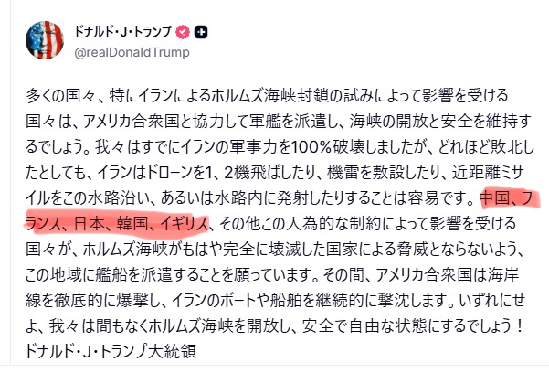 | … | 3126/03/15(日)01:17:45No.1410824996そうだねx6>トランプが自衛隊派遣しろって言ってくるのなんて外す方が難しい絶対分かりきってた内容なのになんで驚いてるの? |