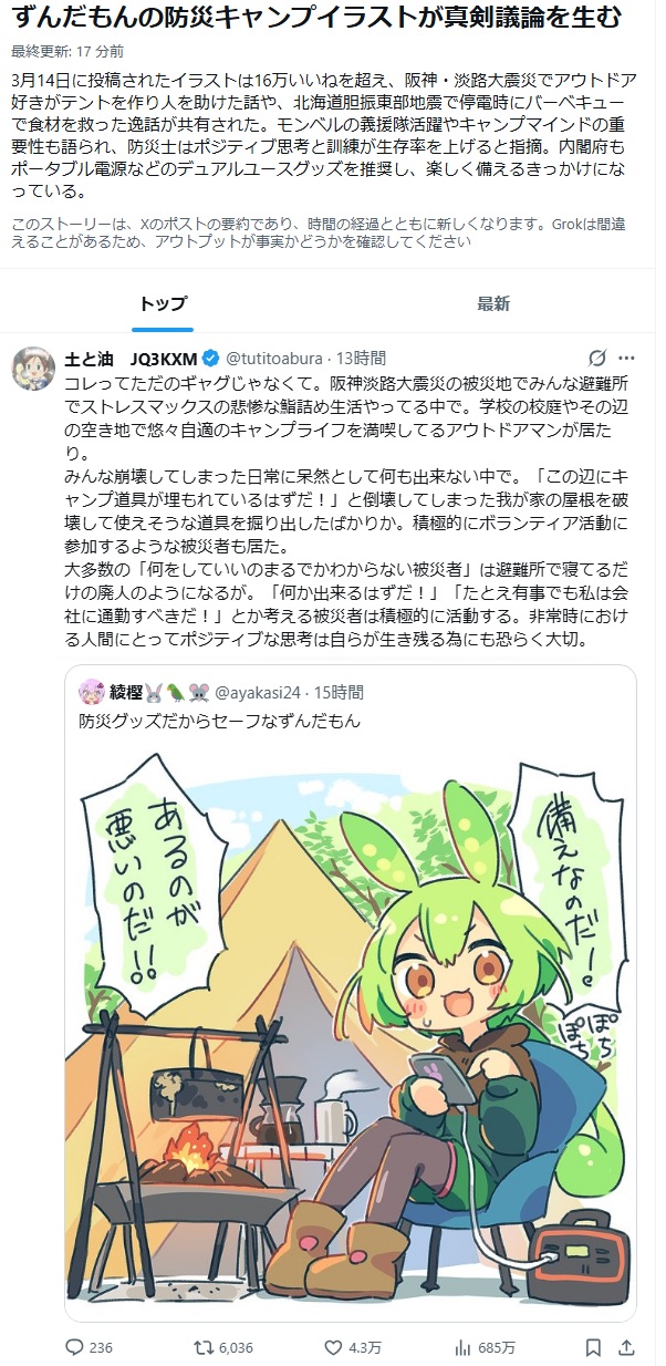 | … | 5826/03/15(日)10:54:23No.1410907521そうだねx2防災グッズ名義で色々買っちゃうのはまぁよくあることだし実際にそれやって助かったし助けられた人もいたっていうポジティブな話題なのになんで不謹慎と思った? |