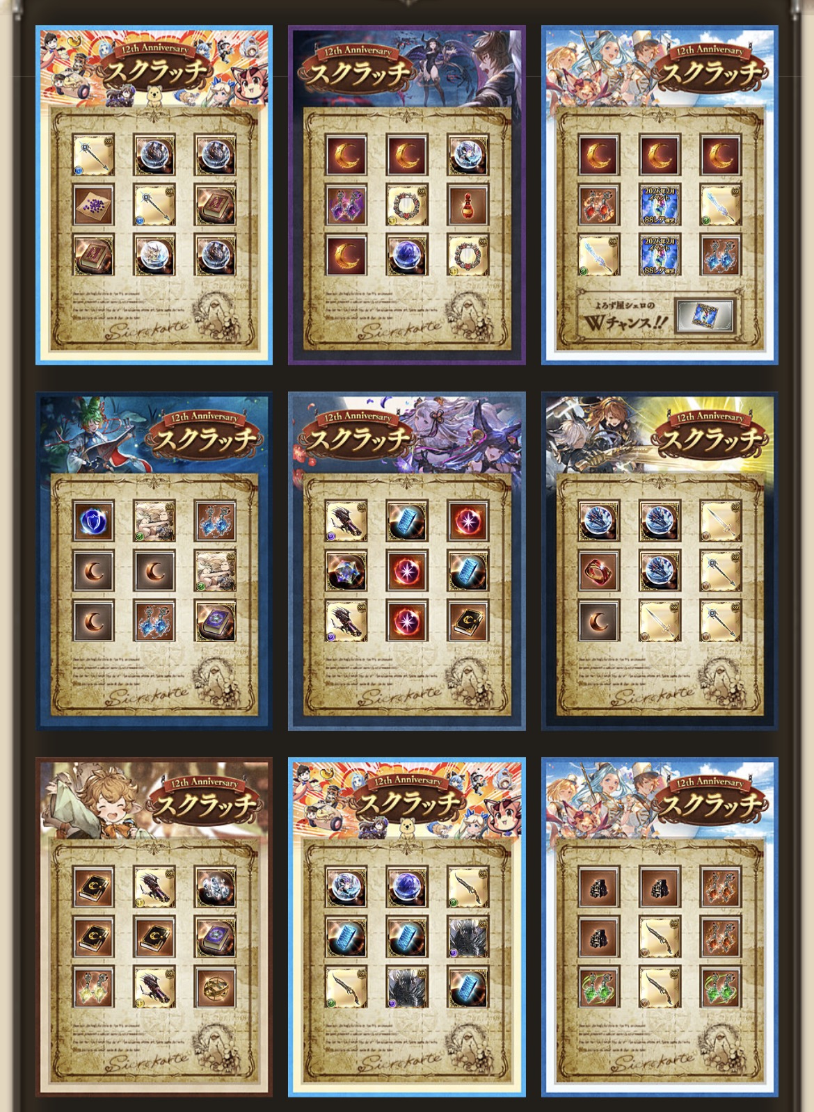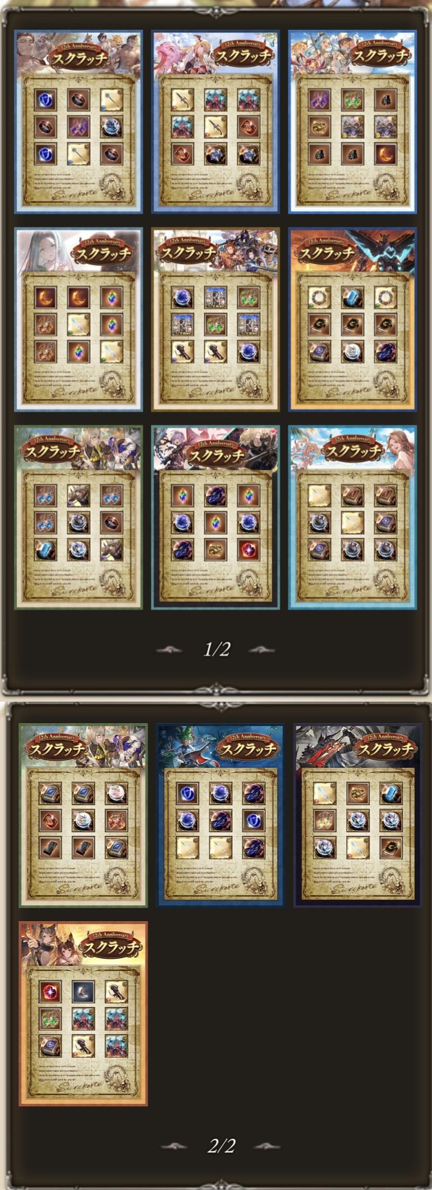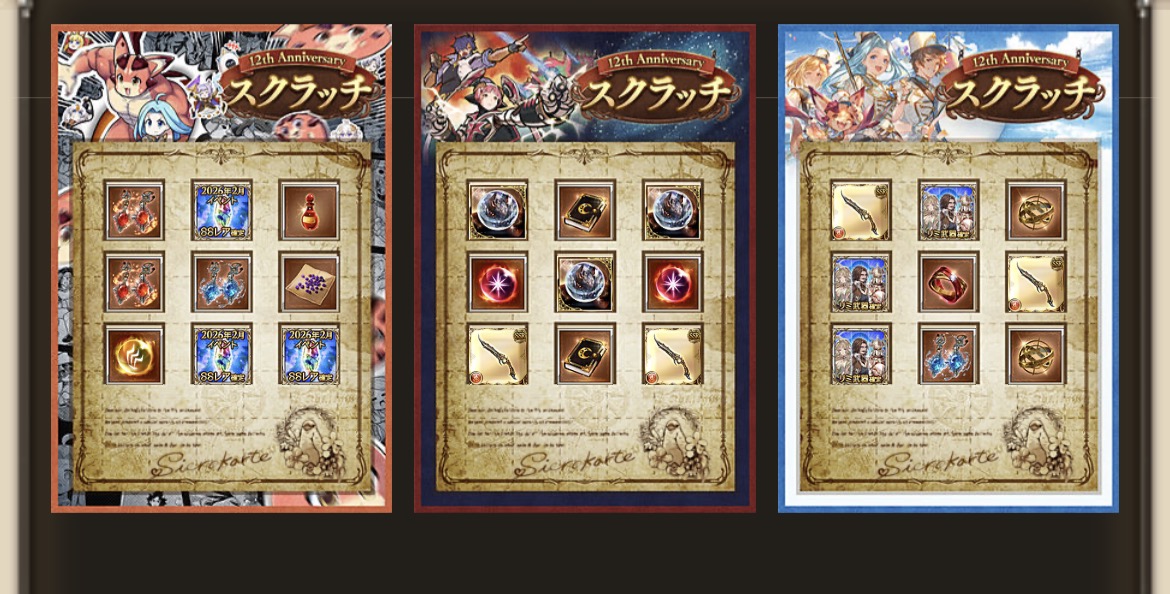 | … | 17526/03/15(日)13:27:07No.1410960695+>スクラッチ最終日の「とあるアイテム」に期待するんだよ ふふ!12周年にふさわしい武器といえば…なんだかわかりますか! |