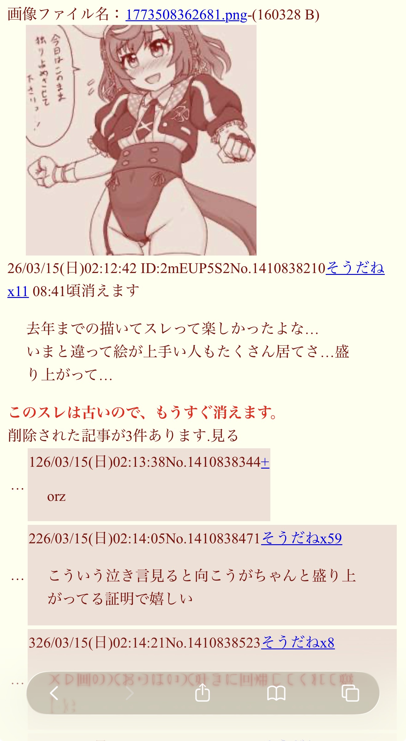 | … | 10026/03/15(日)13:19:29No.1410957867+>うわ…絵師粘着に絡まれた |