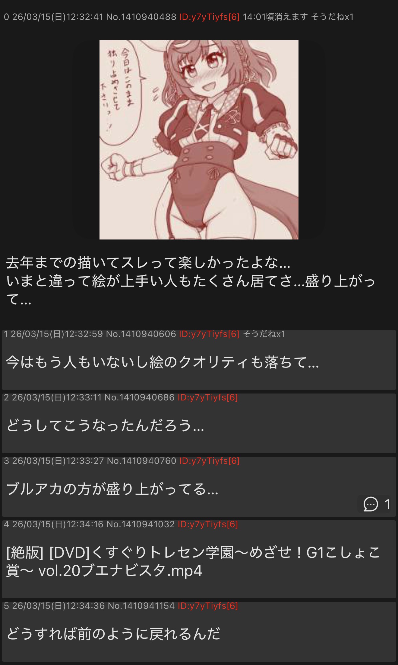 | … | 8326/03/15(日)13:10:59No.1410954426+>スレ画の人トレウマのスレとエッチピクチャーのスレなら伸びてなくても現れてくれるから好き |