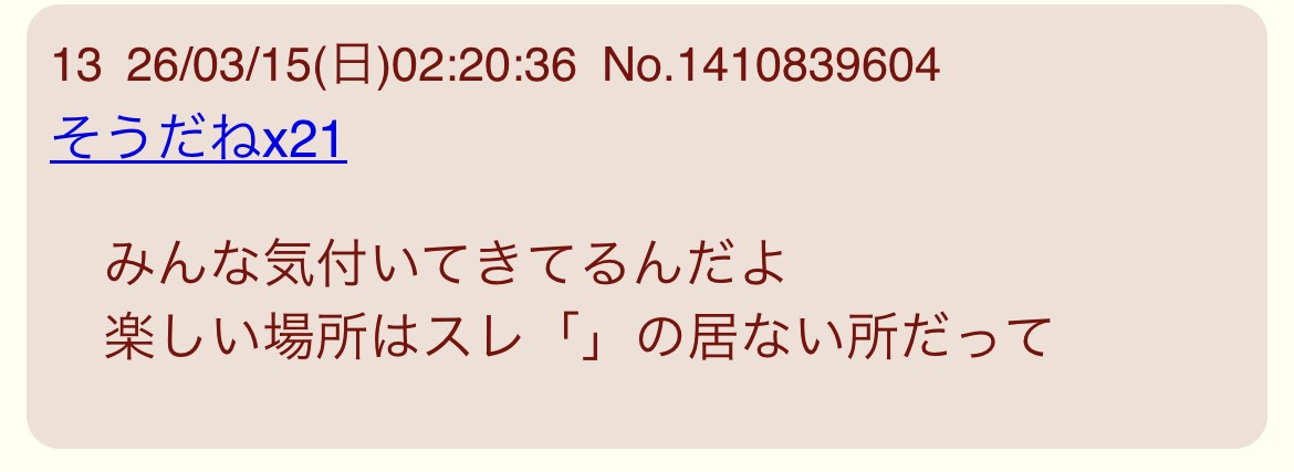 | … | 2526/03/15(日)12:41:53No.1410943835+IDは結構ワイワイしてて賑やかだな |