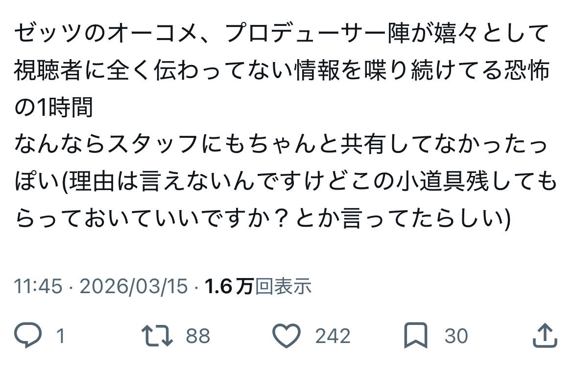 | … | 32726/03/15(日)14:27:12No.1410980951そうだねx2>>>作ってる人達の凄いでしょ!!!この番組凄いでしょ!!!アピールと実際に放送されたものの温度差で脳がどうにかなるから |