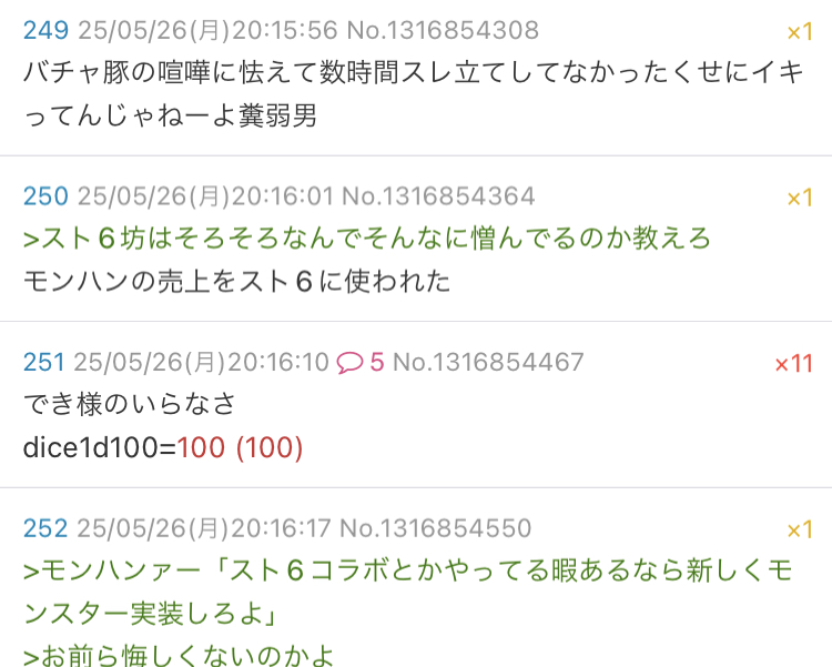 | … | 41426/03/15(日)19:44:45No.1411082145+まずい知らない勝負をさせられて知らない内に負けてる |