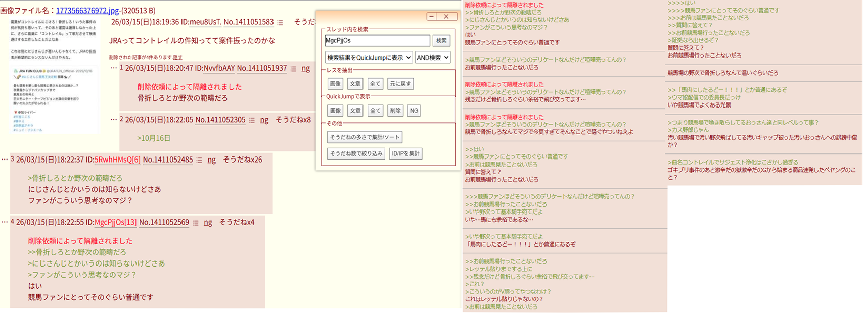 | … | 4526/03/15(日)19:34:47No.1411077901+>競馬スレやウマ娘スレに粘着してるのも確かにじさんじリスナーのヒジキだろ? |
