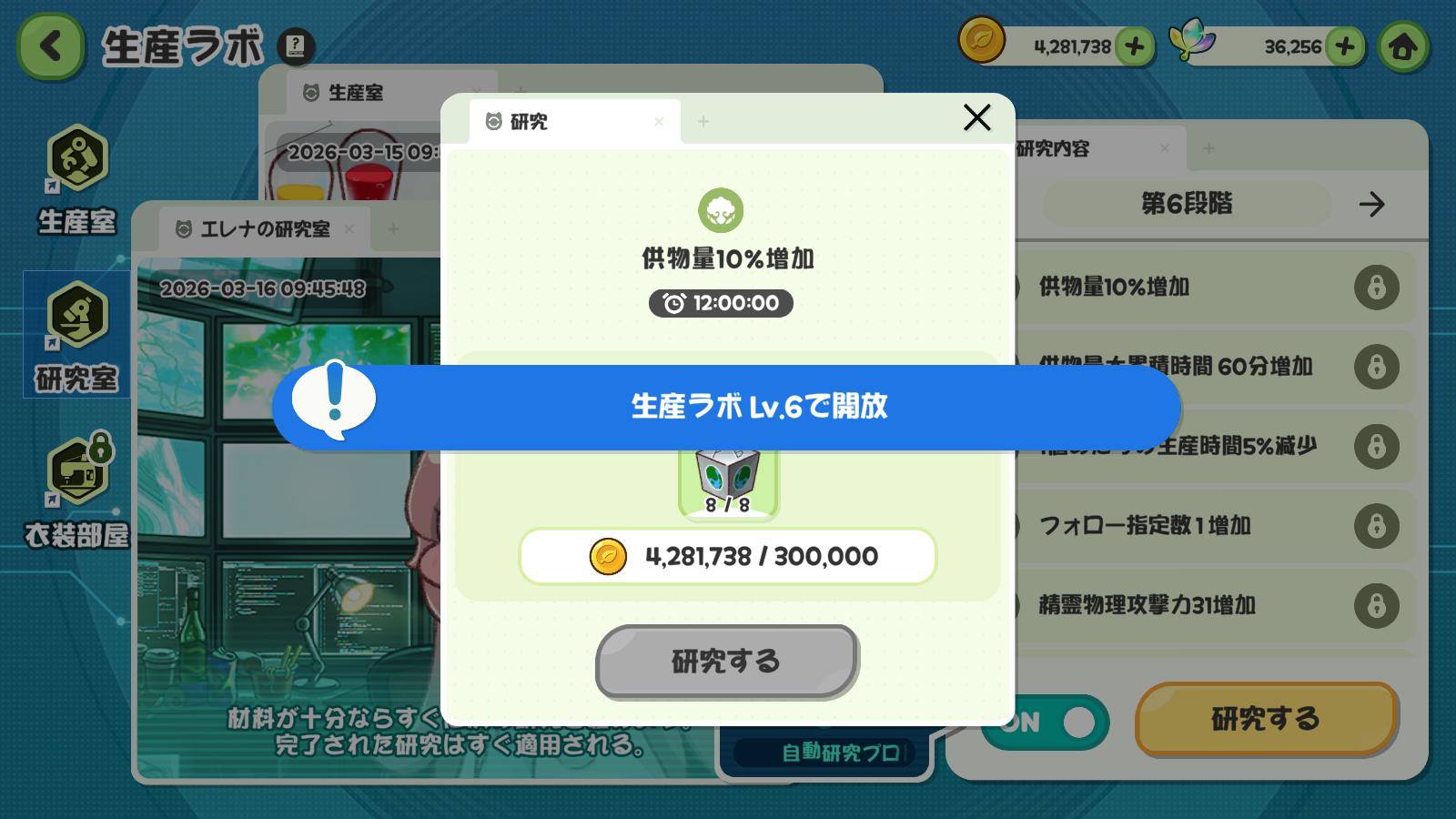 | … | 29726/03/16(月)09:50:57 ID:.AeNXNokNo.1411235713そうだねx1生産ラボレベル上げるには本部レベルも上げてレベルキャップ解放する必要があるからかなりゴールド使うのがきついにゃん |