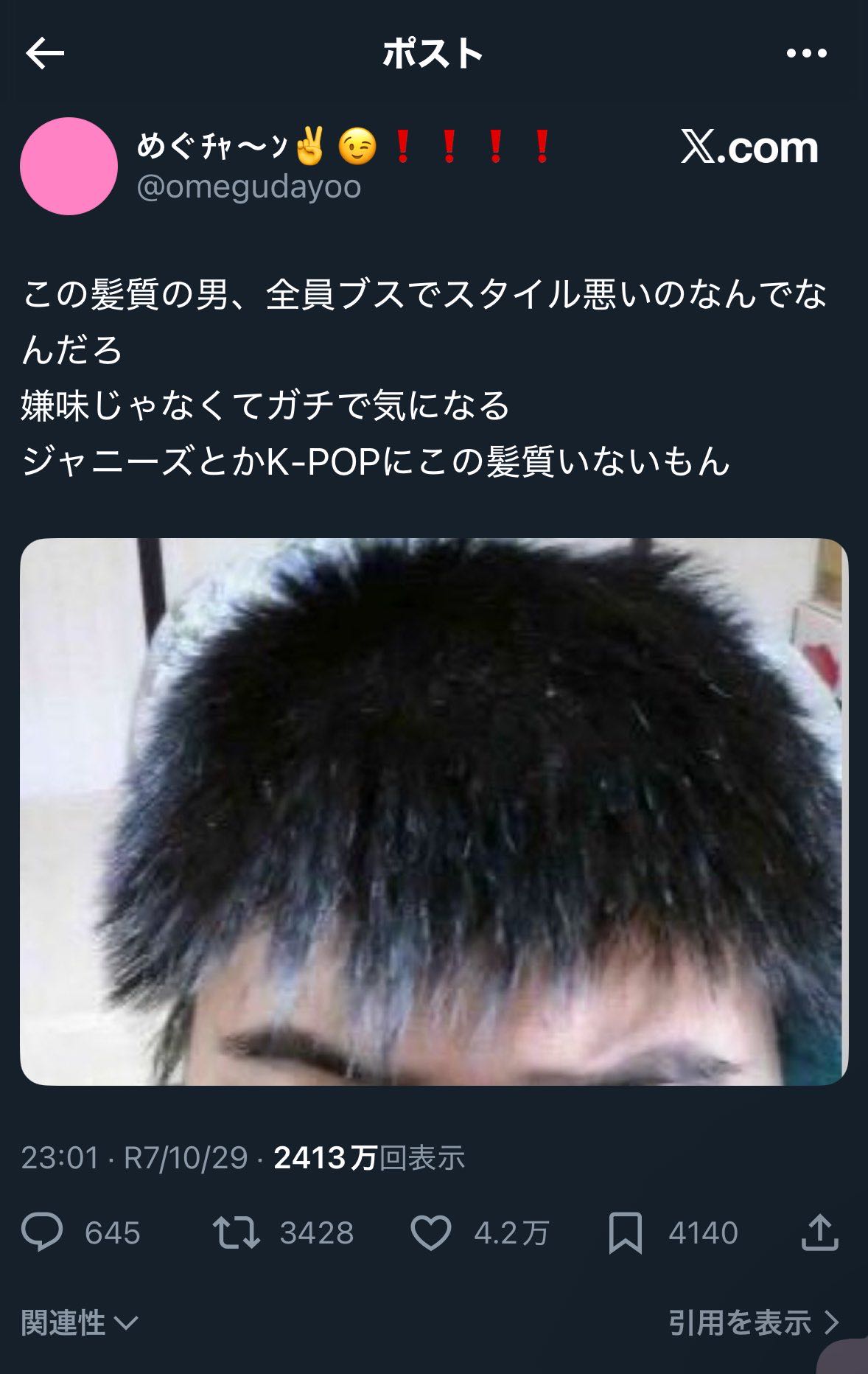 | … | 1926/03/16(月)07:46:43No.1411218646+前にチー牛ヘアとか煽ってたやつ? |