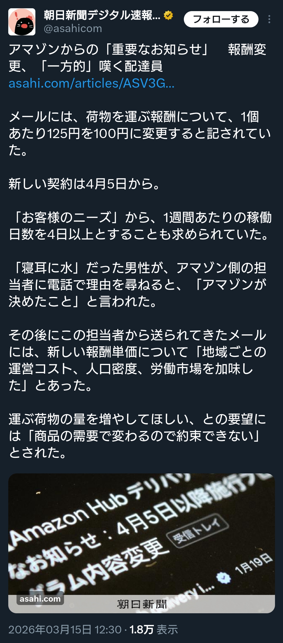 | … | 826/03/16(月)17:59:35No.1411341431そうだねx6Amazon配達の人員確保出来るのか? |