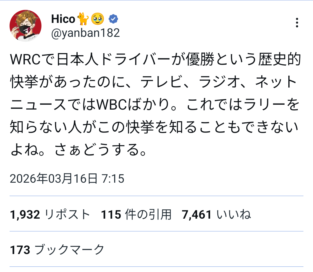 | … | 2626/03/16(月)20:40:38No.1411401733そうだねx7毎年見に行くぐらいラリー好きだけど俺は「」に布教するのは諦めたよ… |