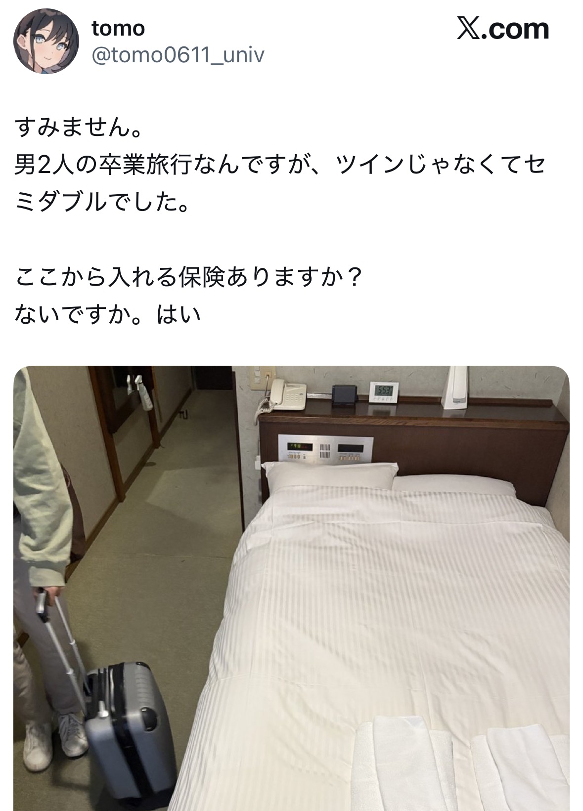 | … | 3026/03/16(月)22:41:53No.1411451064+>逆に一人でシングル予約したのにツインに変えませんか?って言われたことある |