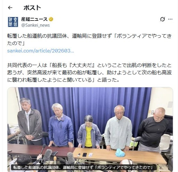 | … | 7526/03/17(火)00:22:03No.1411486557そうだねx4>活動家の隠れ蓑のお船だったのかどうか |