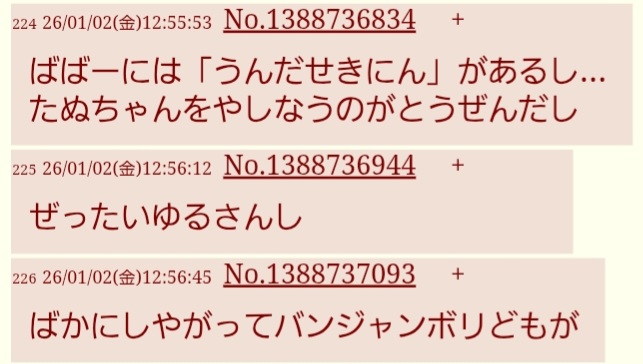 | … | 626/03/17(火)05:00:56No.1411511703+お前が絡むと白けるからやめて |