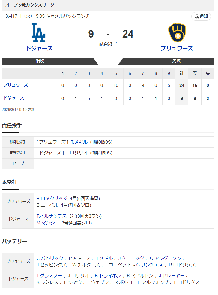 | … | 4426/03/17(火)09:20:38No.1411534312+WSのブリュワーズ戦も小技の応酬でテオのミスもあり厳しい試合もあったよ |