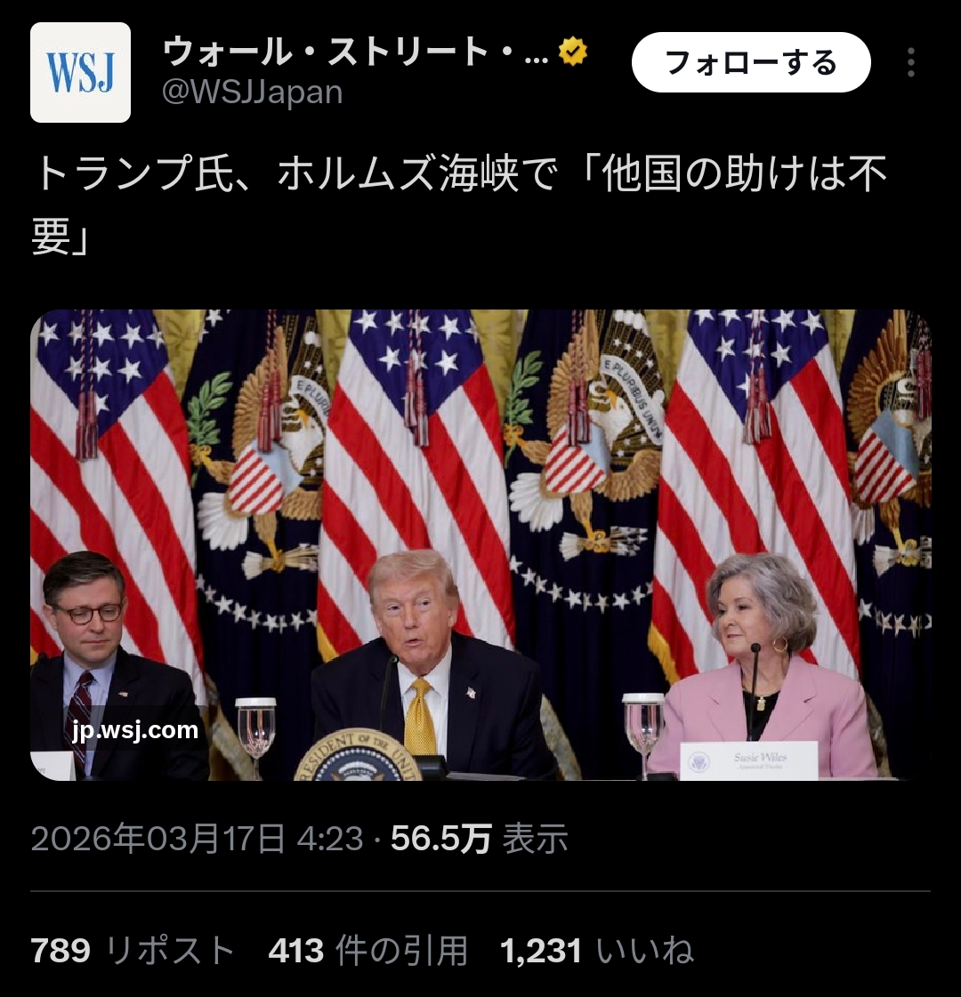 | … | 2026/03/17(火)09:47:01No.1411539051そうだねx3NATOにも「なんで俺の国が他国助ける理由あんの?」ってスタンスなのに |