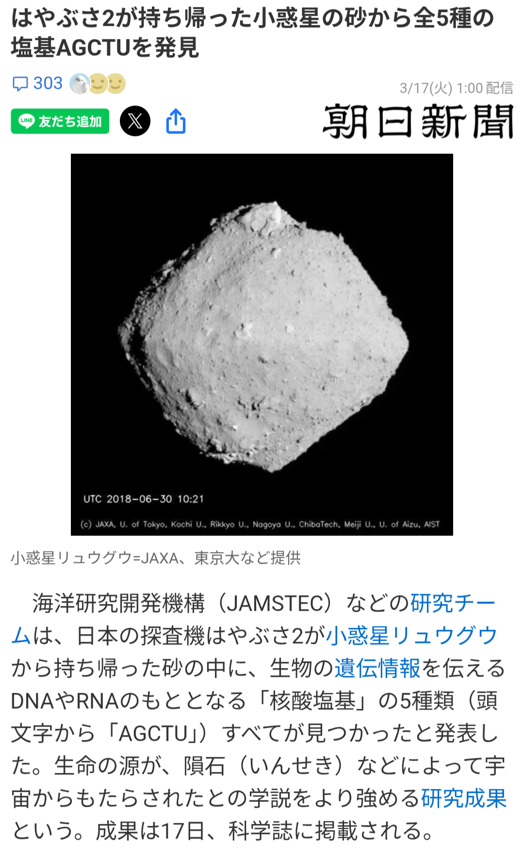 | … | 26726/03/17(火)15:56:09No.1411623590+読みそこなってる「」もいるかもしれんけどNASAがすでに同じ調査結果を小惑星ベンヌで出してるので |